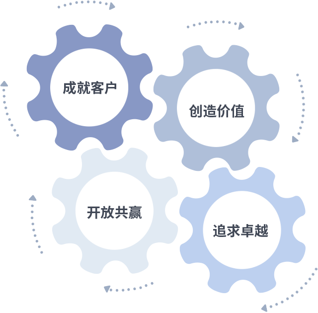 成就客户是一切决策的出发点,创造价值是衡量所有工作的标准,追求卓越是294俄罗斯专享会做事做人的态度,开放共赢是294俄罗斯专享会的格局也是最终的结果。价值观的齿轮环环相扣,推动着组织里的每个人不断向前。